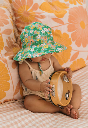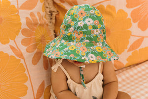 A fun and fabulous sunhat for little ones, featuring a 70's vintage-inspired mint floral print designed by Melbourne artist Jacinta Weir of Two Little Ducklings. Crafted from 100% cotton (including lining), it’s soft, breathable, and gentle on delicate skin.