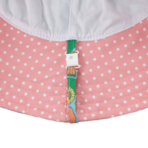 Let little imaginations bloom in the sunshine with this stunning wide-brim sunhat, featuring a gorgeous vintage-inspired mint floral print on the outside, designed by Jacinta Weir from Two Little Ducklings and sweet pink and white polka dots on the inner brim.