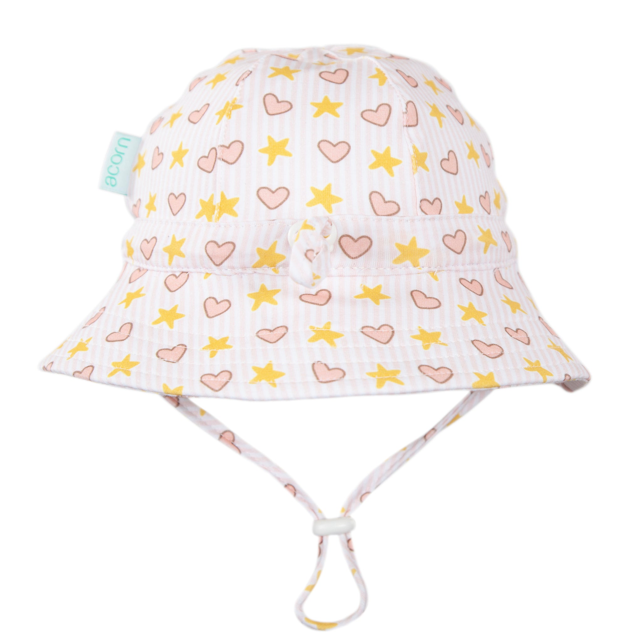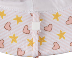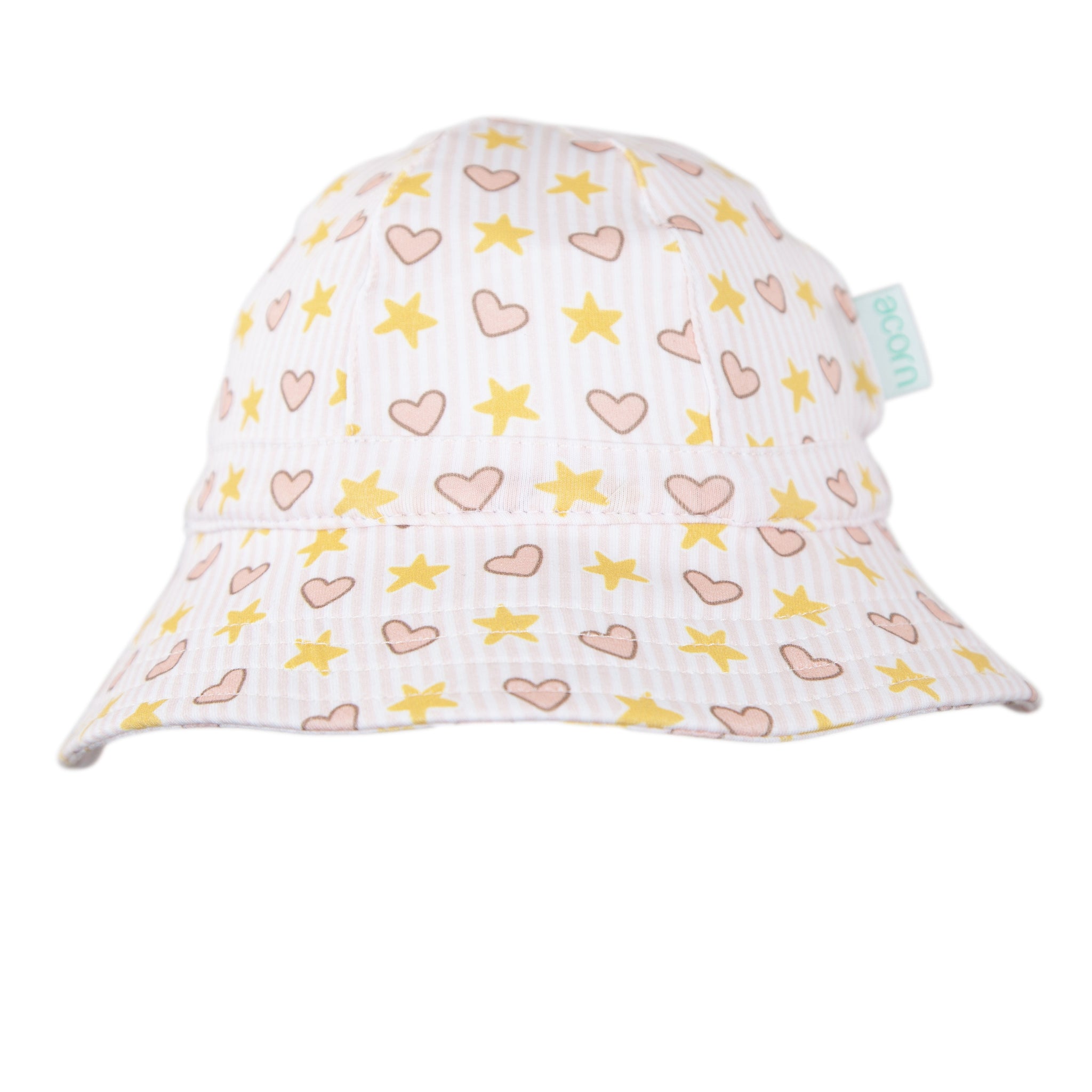 This soft bucket hat with a pink striped base and fun stars and hearts print is a playful way to keep little ones sun-safe this summer. The original print was created by Melbourne artist Jacinta Weir from Two Little Ducklings.