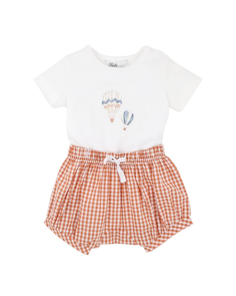 Up, up and away! This charming 2-piece set features a soft cotton bodysuit adorned with a dreamy hot air balloon print, perfectly paired with gingham bloomers in a warm rust tone. The bodysuit includes a convenient press stud shoulder opening for easy changes, while the bloomers have a comfy elastic waistband and are gently cuffed at the legs for a sweetly tailored finish.