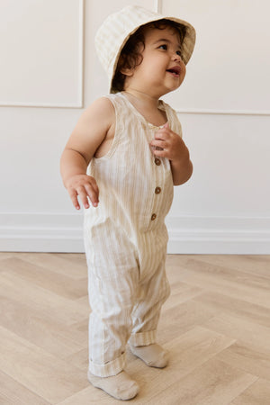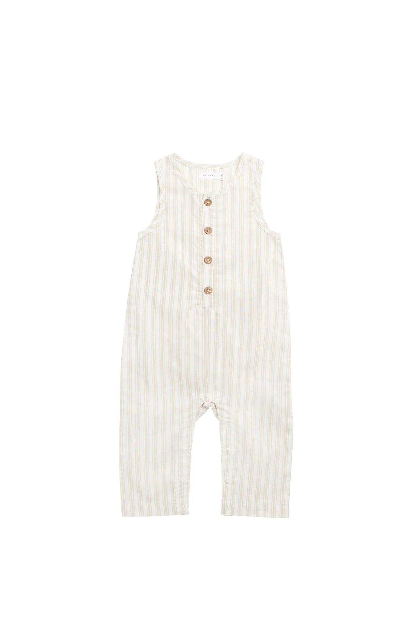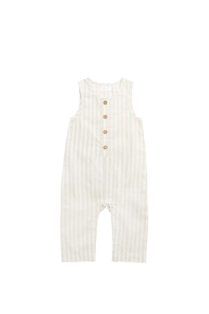 A timeless and practical piece for your little one, the Milo Jumpsuit in Variegated Stripe Foam features a neutral stripe. With a sleeveless design and button-down front, this full-length jumpsuit is perfect for layering or wearing solo on warmer days.