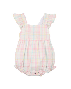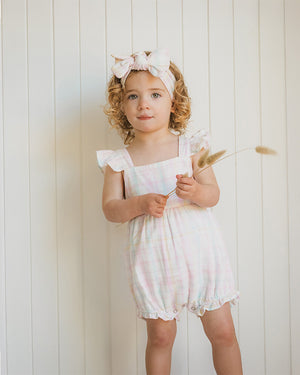 A sweet and breezy essential for sunny days, this pastel check romper brings vintage charm with a modern twist. Crafted in a soft and lightweight Organic Cotton, it features a pretty all-over check in sorbet tones and dainty frill straps that cross over at the back. With a gently elasticated waist and leg openings with frills, and a concealed press stud crotch opening for easy changes, it’s designed for comfort, movement and all-day play. Complete the look with the Madelyn check headband for an adorable outfit from head to toe.