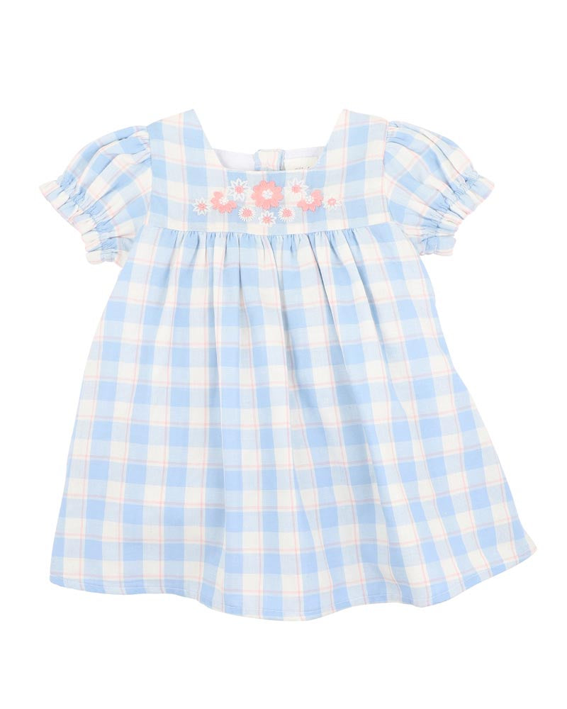 A little dress made for sunshine days. The Bonnie Check Embroidered Dress features soft pastel blue and pink gingham, with a beautifully embroidered floral yoke that adds a charming vintage feel. Gently puffed sleeves with frill detail and a softly gathered skirt create a sweet silhouette, while the full cotton lining ensures all-day comfort. Ideal for special outings or everyday adventures.