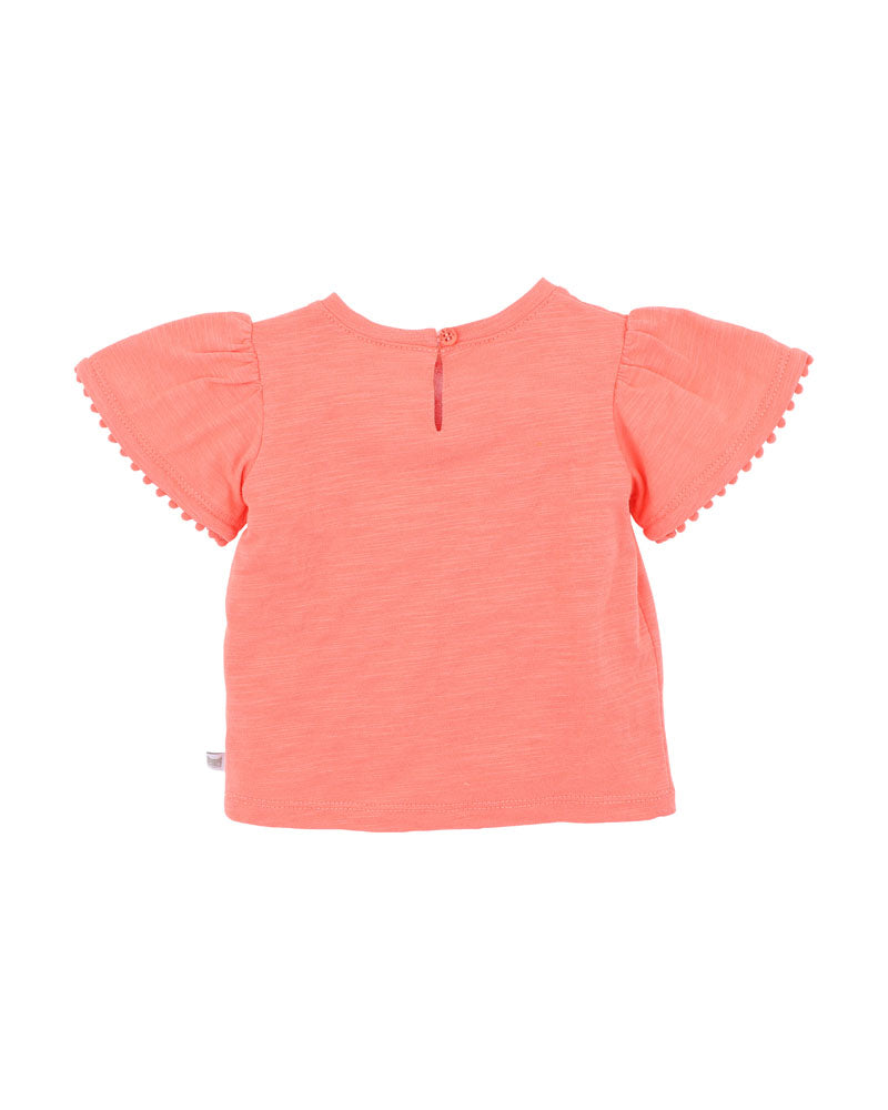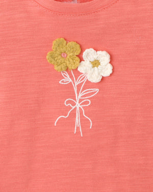 A little bouquet of sunshine, stitched to brighten their everyday adventures. This sweet coral tee features delicate crochet flowers and soft flutter lace trimmed sleeves, making it perfect for sunny day playdates and garden strolls. Pair it back with the Grow Wild print Bloomers for a playful, coordinated look.