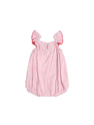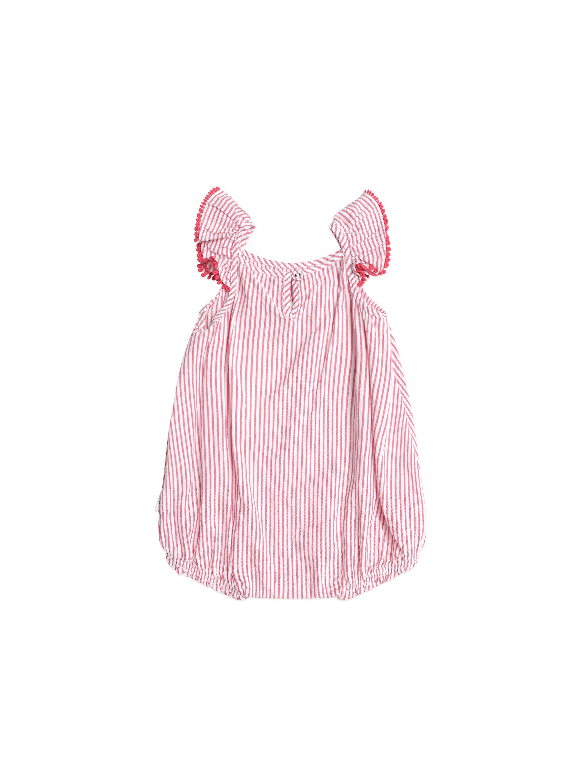 The prettiest playsuit you’ve ever seen. Made from buttery soft cotton in cherry stripe, it features sweet shoulder ruffles and an embroidered gingerbread girl. Stainless steel crotch snaps for snappy changes. Just add squishy legs.