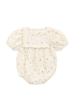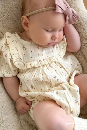 he Organic Cotton Muslin Odette Playsuit – Dina Antique is a beautifully whimsical piece, perfect for warm days and special occasions. Featuring a delicate floral print on a soft antique base, this sleeveless playsuit includes flutter sleeves and a ruffled neckline for a vintage-inspired silhouette. The gathered bodice adds gentle volume, allowing for comfortable movement and an elegant finish.