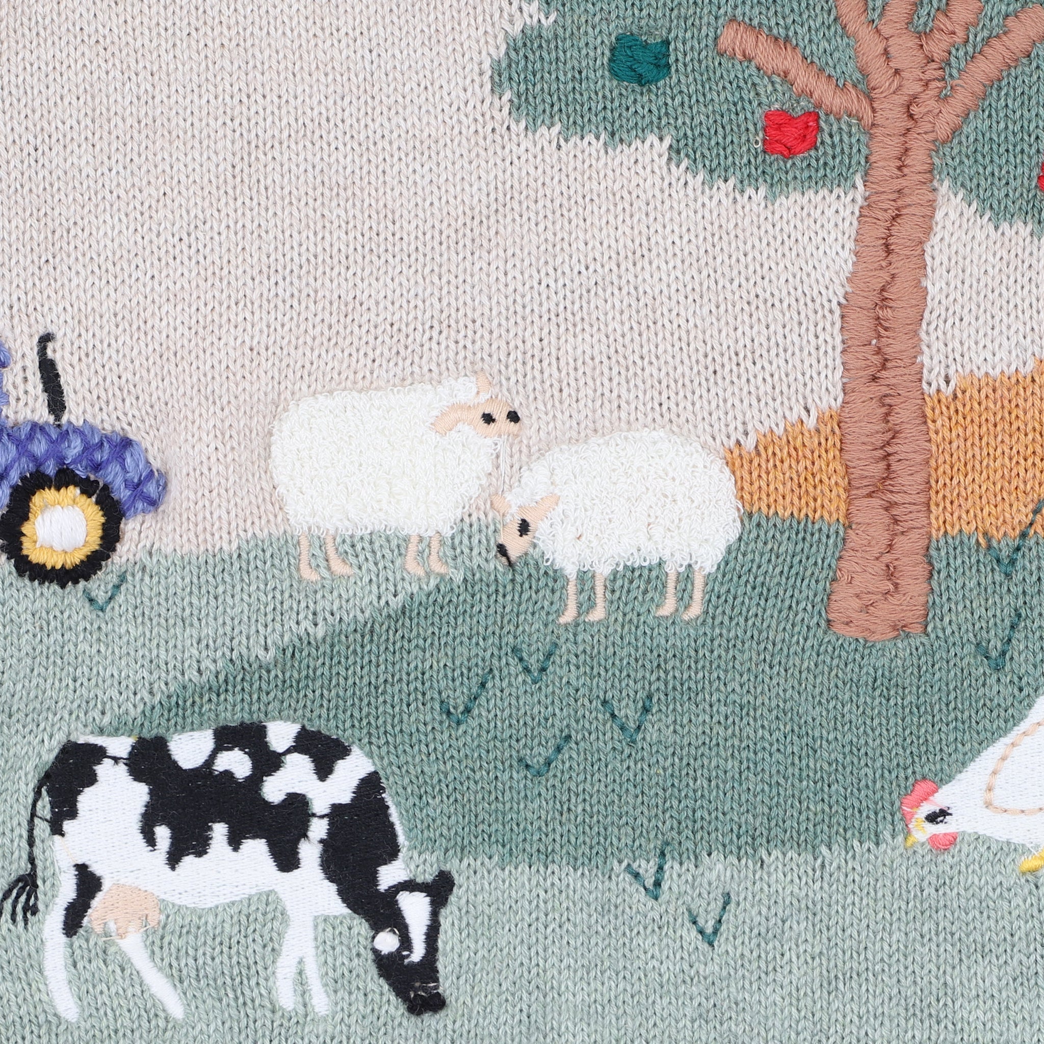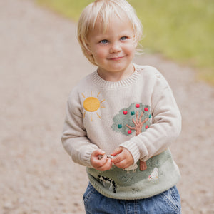 A charming little knit that brings the countryside to life. Crafted in a soft organic cotton and wool blend, this cosy jumper features a beautifully embroidered farmyard scene with grazing sheep, a tractor and apple tree details. Designed for everyday comfort, it’s a sweet layering piece for cooler days and curious little explorers.