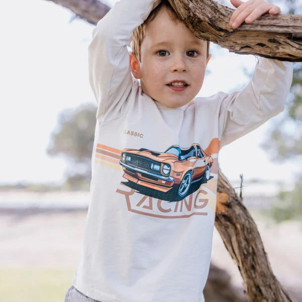 Milky Clothing Retro Racer Tee is made for little speedsters with big imaginations. Featuring a cool grey base and a bold front graphic of a vintage race car with racing inspired text, this long sleeve tee brings retro vibes with modern comfort.