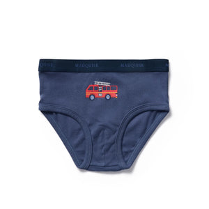 Made from 100% soft cotton, this fire truck-themed two-pack brings comfort and imagination to everyday essentials. Includes one navy pair with a bold fire truck motif on the front, and one blue pair with an all-over fire truck print. Designed for comfort, with an elastic waistband and a great fit.