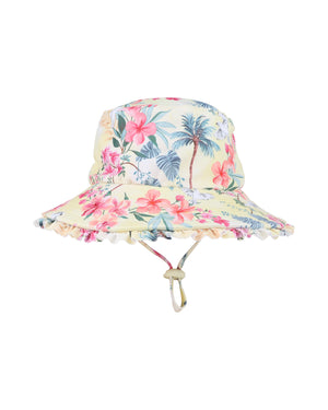A tropical daydream of palms, pink flowers and fluttering white cockatoos on a yellow background, this sweet sunhat is ready for days spent under golden rays. Finished with a delicate frill and secure chin tie, it's both playful and protective.