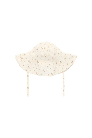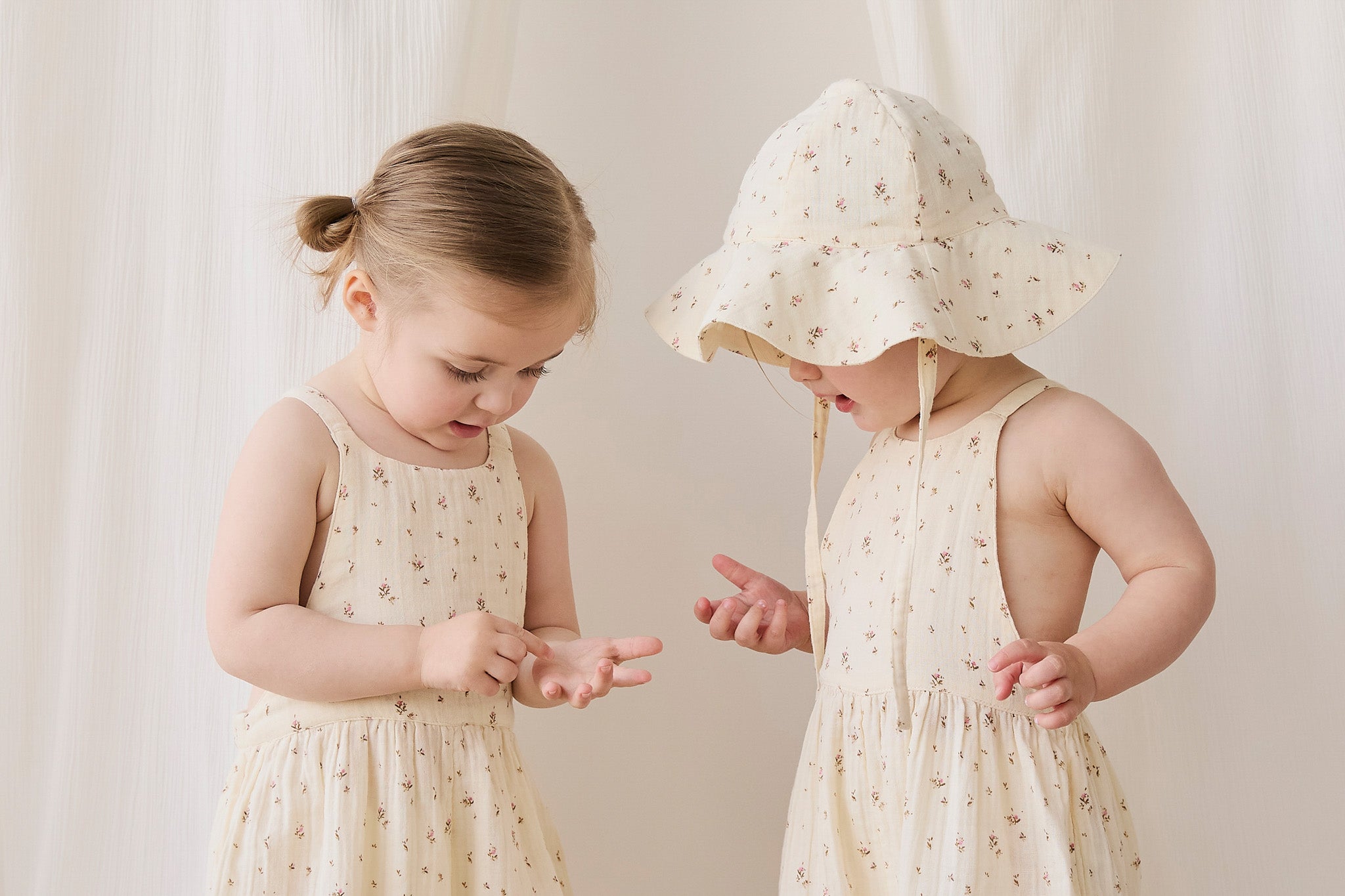 A sweet and sun-safe essential for your little one. The Noelle Hat in Dina Antique features a soft off-white base adorned with delicate floral prints, a wide brim for gentle sun protection, and tie straps to keep it securely in place. Perfect for sunny strolls and outdoor play, this hat adds a charming floral touch to any outfit.
