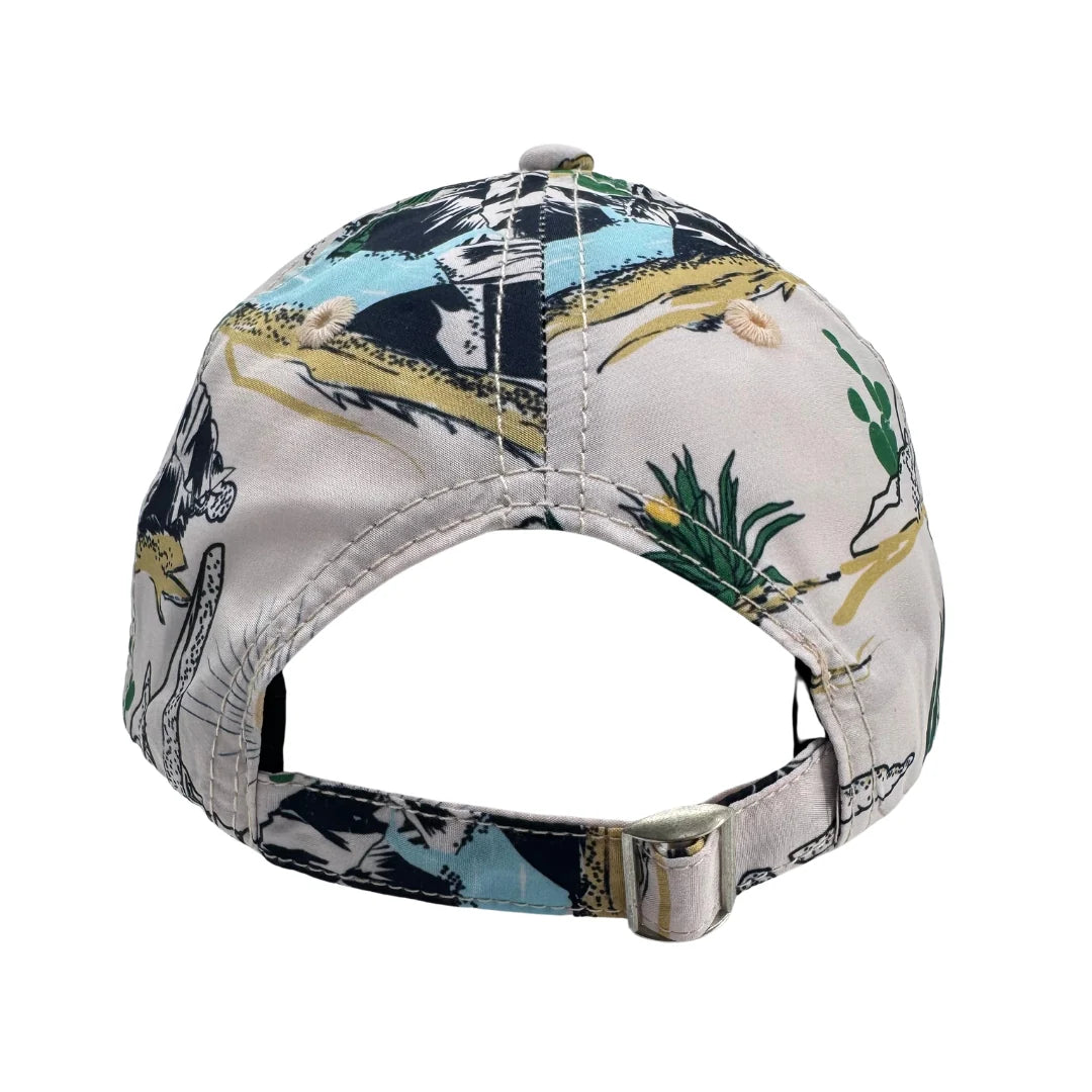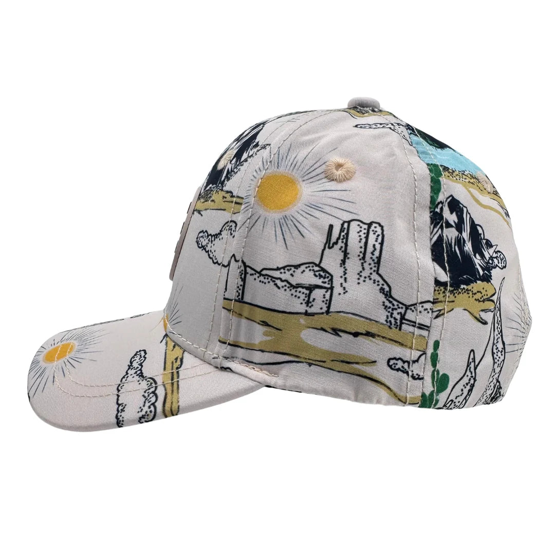 Introducing our Oakland Baseball Cap. It features a cool, neutral-coloured print of cacti and mountains, combining earthy tones like sandy beige, green, and black for a stylish and modern look. It features an adjustable closure, a pre-curved peak and rubber logo and is perfect for girls and boys alike.