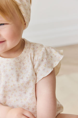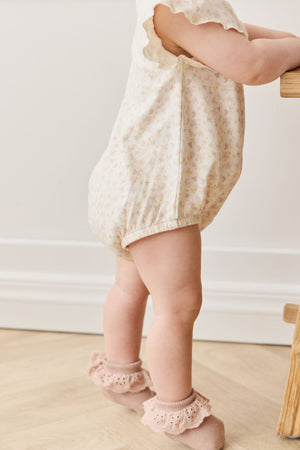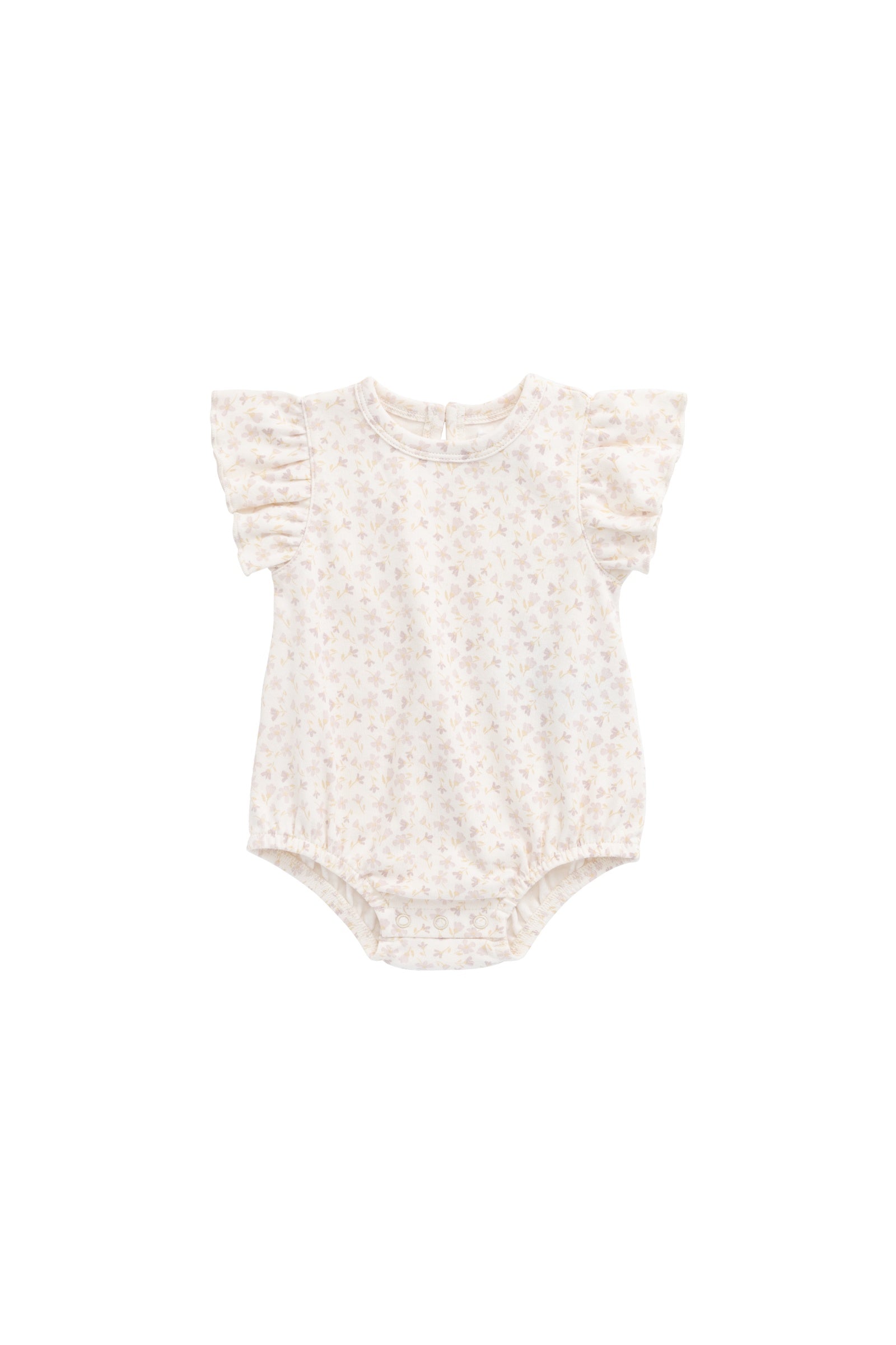 A beautifully delicate piece for your little one, the Sage Onepiece in Aries Mauve is designed for comfort and charm. Featuring short ruffled sleeves, a round neckline, and elasticated leg openings with snap closures, this onepiece is perfect for warm days or layering under cozy knits. The soft cream base is adorned with a subtle floral print in light mauve, adding a gentle touch to its sweet silhouette.