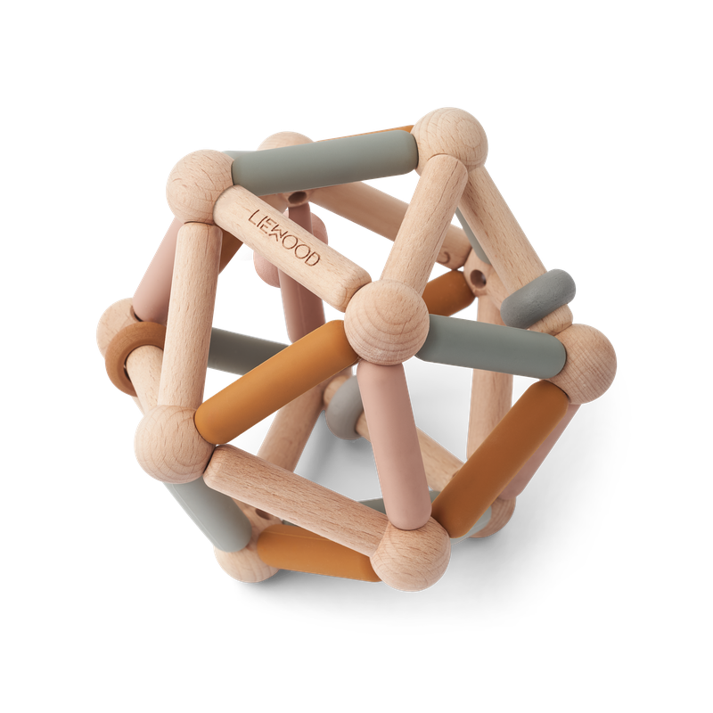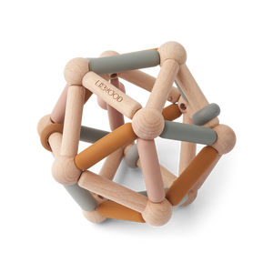 Rattle toy for babies, designed to further motoric development. Made from high-quality silicone and natural Beechwood, it is designed for little hands to grasp and hold, turning and exploring the shapes and colours of the toy. Provides fun and sensory playtime for the smallest members of your family.
