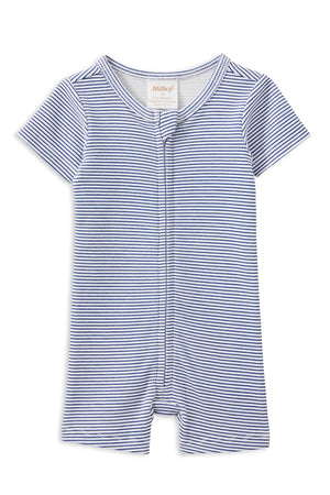 Milky Clothing Blue Rib Zip Romper. Introducing our adorable Blue Rib Zip Romper, the perfect blend of comfort, style, and functionality for your little one. Crafted with utmost care and attention to detail, this romper is designed to keep your baby snug and stylish all day long. Featuring a horizontal stripe in blue and white, this romper adds a touch of charm to your baby's wardrobe. The playful design is complemented by a convenient center front 2-way zip, making dressing and nappy changes a breeze.