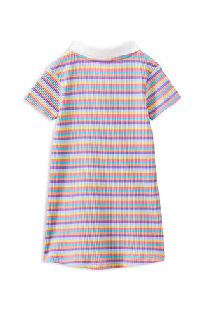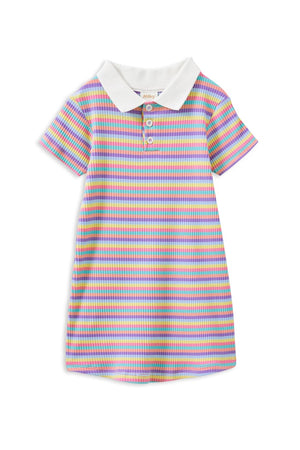 Milky Clothing Multi Stripe Rib Dress. A burst of colour and a whole lot of comfort. This rib dress is made for sunshine and smiles, featuring bold multi-coloured stripes and a sporty white collar. The stretch rib fabric moves with your mini, while the tunic style A-line fit keeps it easy and breezy for every adventure. Finished with short sleeves and a 4-button placket, it’s a fun, fuss-free option for busy mornings and backyard play.