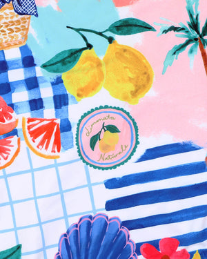 Bright, fun and full of coastal charm, this one-piece swimsuit features an Amalfi inspired vibrant patchwork of lemons, beach scenes, and painterly checks. Designed with a flattering scoop neck and stylish cross-back straps, it's fully lined for comfort and perfect for long days by the pool or sea.