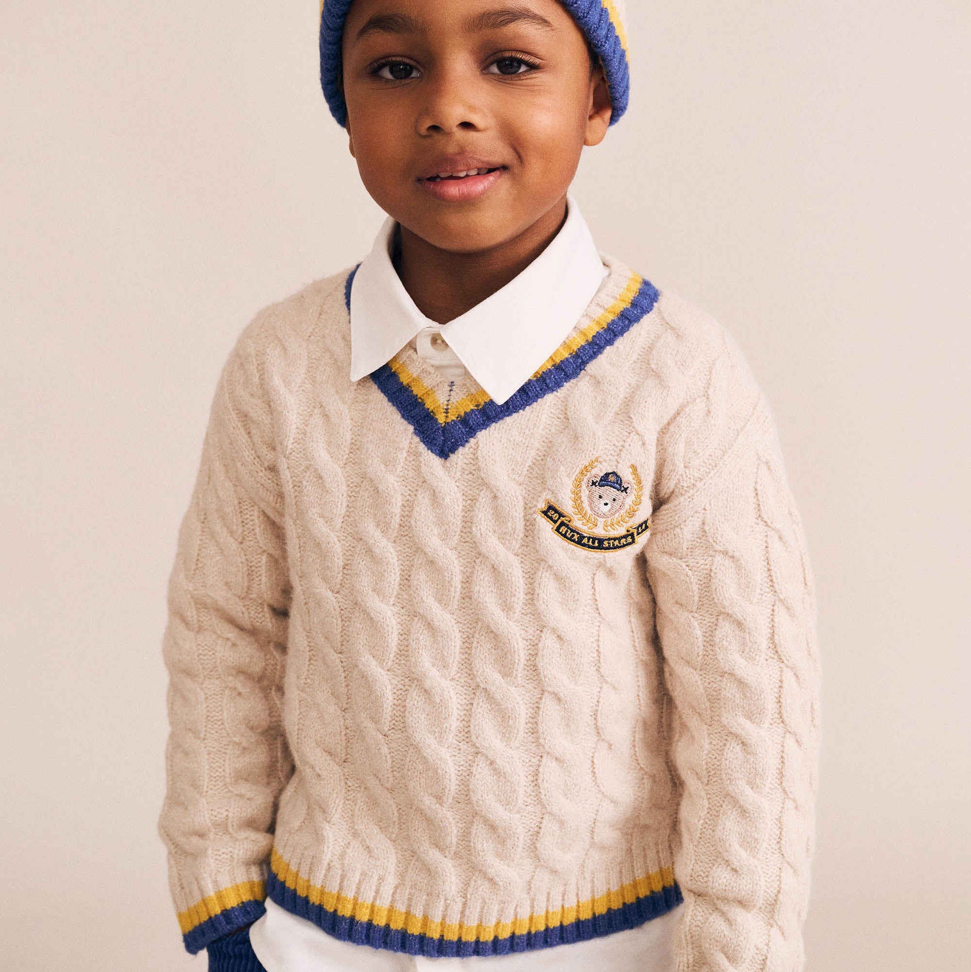 Meet the ‘wear everywhere’ sweater. This knit jumper is made from premium blend in a deliciously soft jacquard knit with our custom Huxbear print and V neckline. Light enough to layer and cosy enough to wear on its own, featuring shoulder buttons in baby sizes for easy dressing.