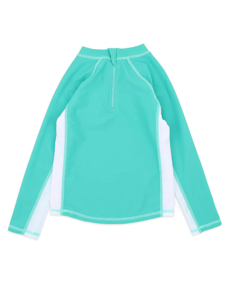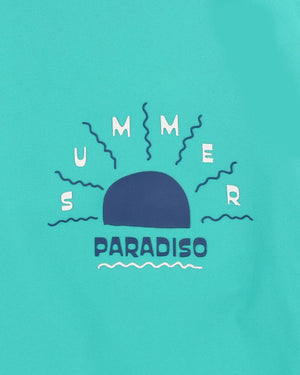 A fresh take on sun-smart style, this teal green long sleeve rash top is designed to move with them through every swim, splash, and dive. With bold white side panels and a sun-inspired chest print that reads Summer Paradiso, it's the perfect layer for long days in and out of the water. Pair it back with the Luca print or Luca stripe boardshorts for a head-to-toe coastal look.
