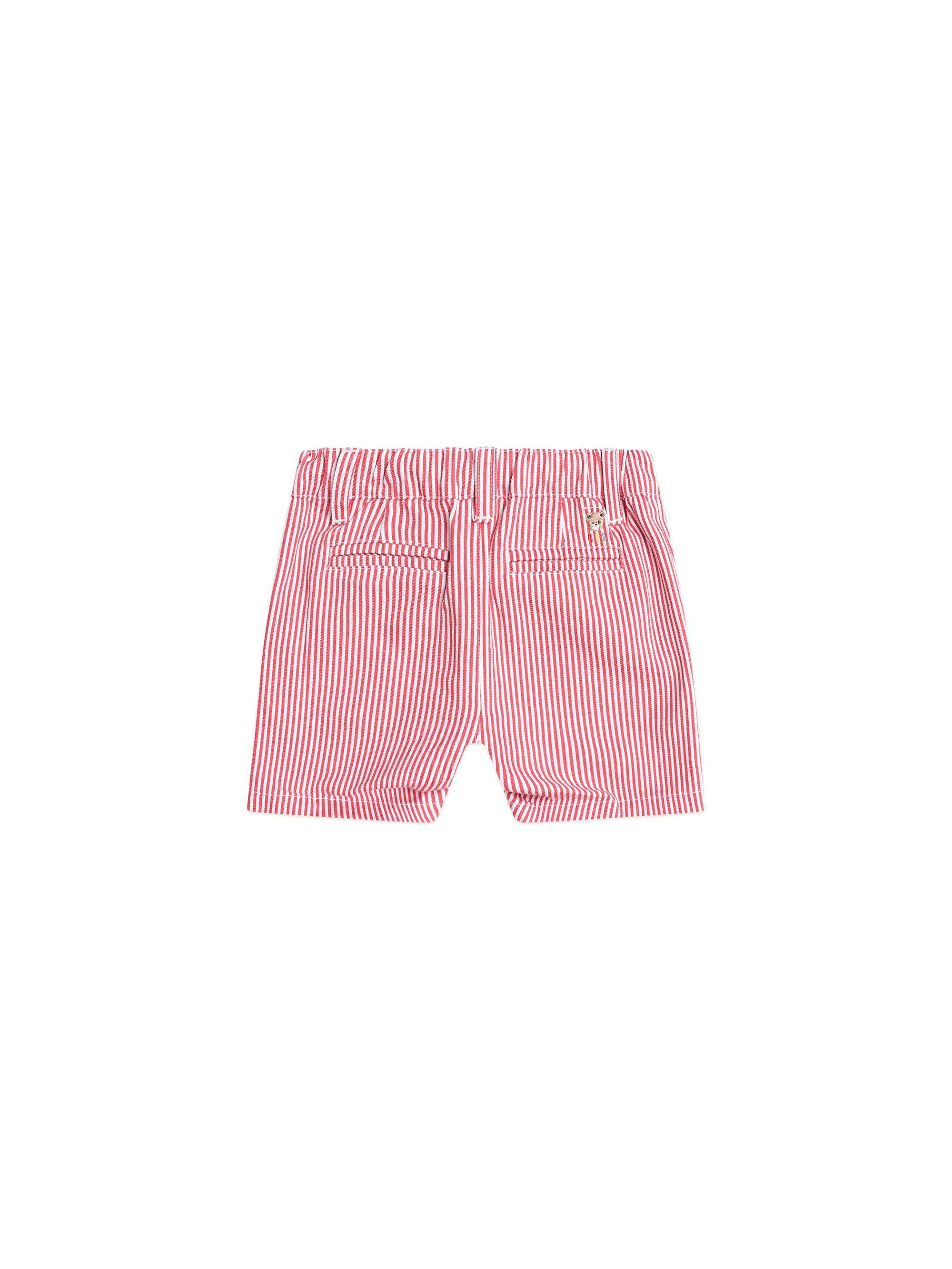 The perfect red pinstripe chino short for warm weather festive occasions. Dress them up or down. Made from a soft cotton twill, they feature a peeping Huxbear embroidery on the back and an internal button waistband and belt loops for adjustable waist.