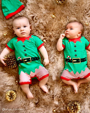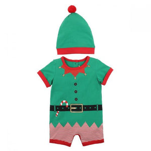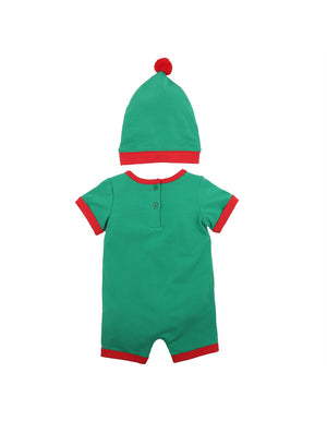 Get into the Christmas spirit with this elf detail print short sleeve short leg romper featuring contrast binding and matching hat. Garment photographed in size 00 (3-6mth).