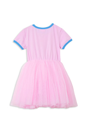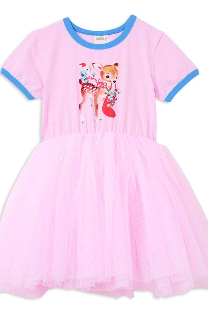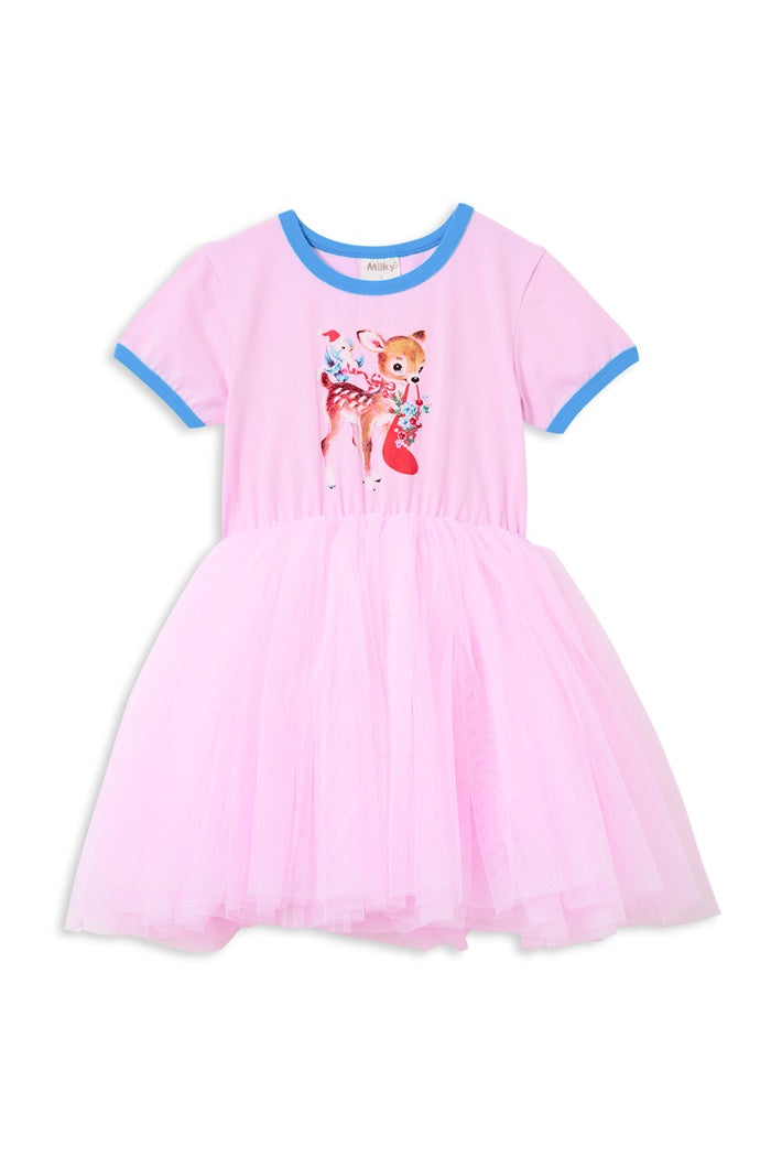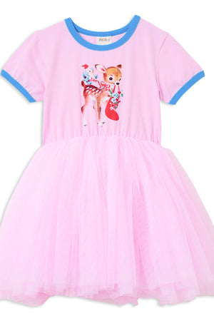 Introducing the Festive Friends Tutu Dress, This adorable dress showcases a charming deer carrying a Christmas stocking, set against a soft pink background with delicate blue ribbing around the neckline and sleeves. Designed to offer both comfort and whimsical charm, it's perfect for keeping your little one festive and cheerful throughout the holiday season. With its playful design your little girl will love twirling in this tulle dress, sure to draw plenty of compliments wherever your child goes!