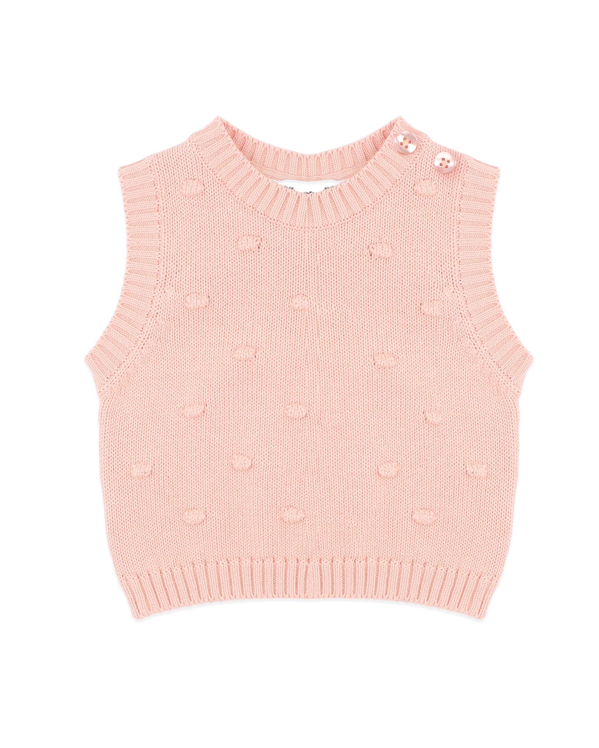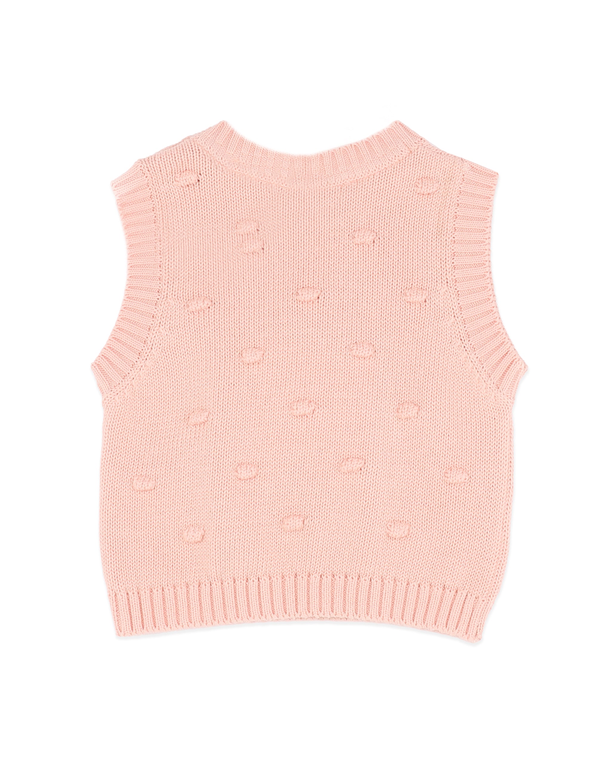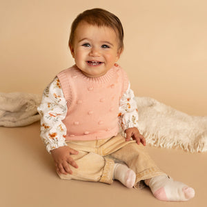 A sweet little layer designed for cooler days and cosy moments, this bobble knit vest is crafted from beautifully soft organic cotton with a touch of wool for warmth. Finished in a gentle blush tone, the textured bobble knit adds subtle charm while keeping things timeless and easy to wear. Perfect for layering over tees, bodysuits or knits, it’s a thoughtful piece made for comfort, softness and everyday wear.