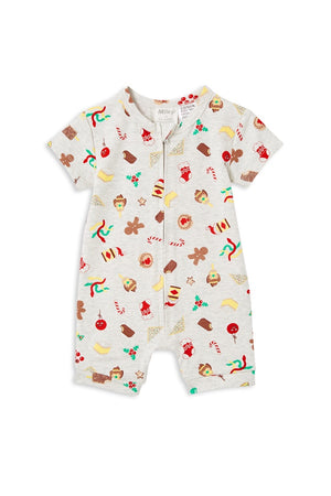 Milky Clothing Summer Christmas Zip Romper. Introducing our adorable festive romper, expertly crafted to offer your little one the ultimate trifecta of comfort, style, and practicality. Designed with care and attention to detail, this romper ensures your baby stays cozy and fashionable throughout the day. With its silver marle base and delightful all-over Christmas themed print, it injects a festive flair into your baby's wardrobe. Plus, the thoughtful addition of a convenient center front 2-way zip simplifies dressing and nappy changes, making your life a breeze.